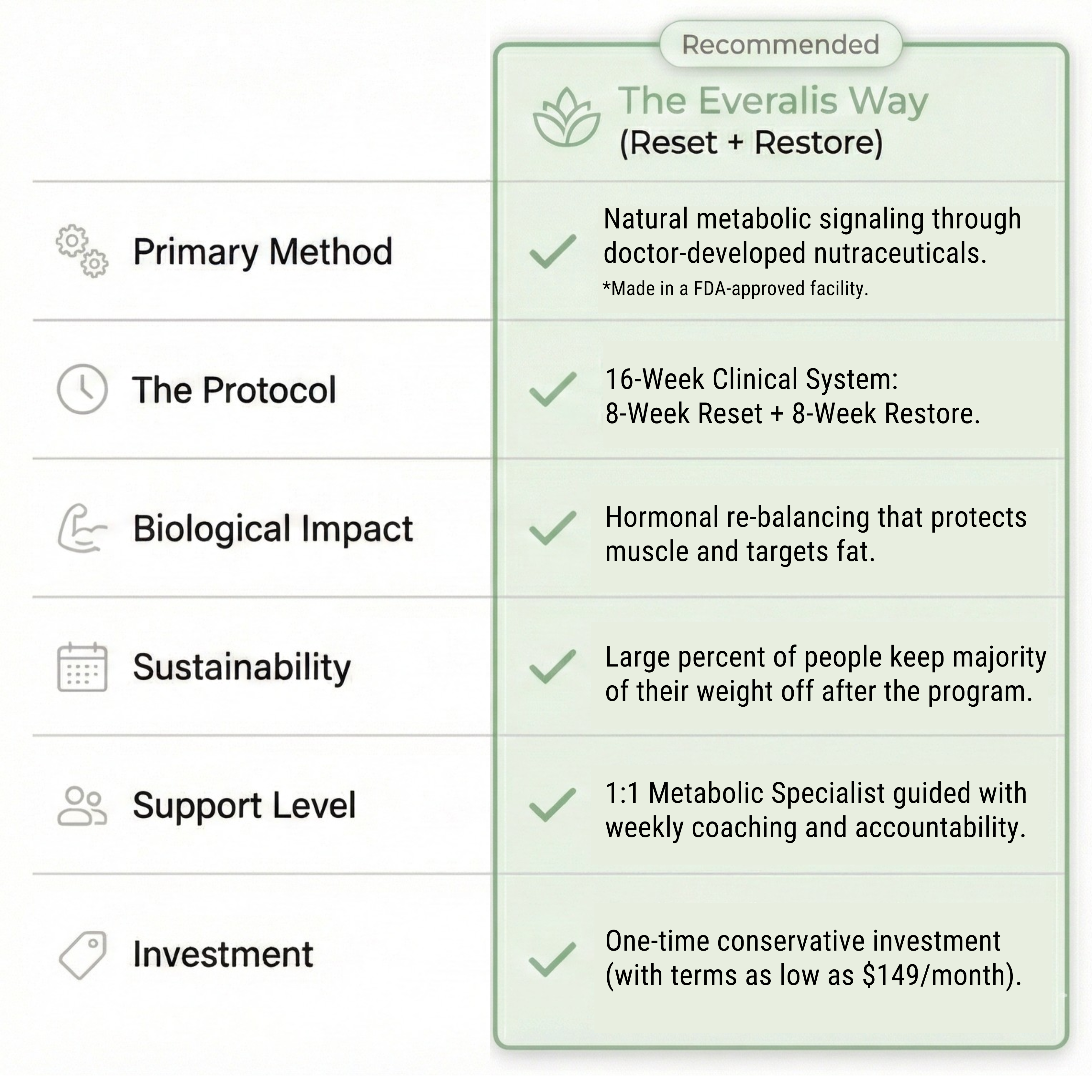 Injections are a chemical band-aid; Everalis is a biological renovation. Instead of a lifelong dependency on a drug, our 16-week protocol addresses the issues in your metabolic pathways to target fat while strictly protecting lean muscle— an essential factor for healthy aging. We don’t just suppress your appetite; we fix your metabolic baseline so you can graduate to long lasting stability without needles or ongoing prescriptions.